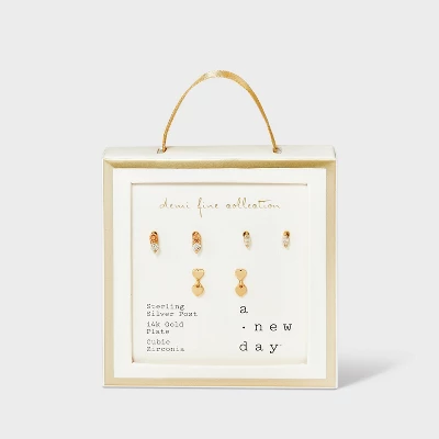 14K Gold Plated Cubic Zirconia Heart Stud Earring Set 3pc – A New Day™ Gold